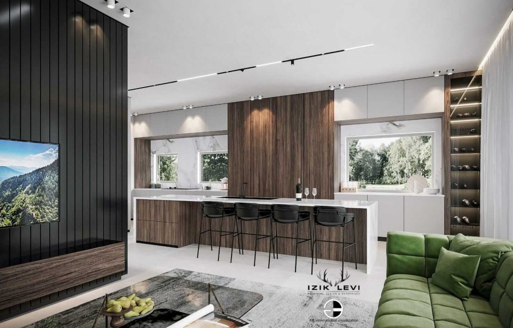 בית פרטי המעוצב בסגנון מודרני המשלב בתוכו אלמנטים מחופים בעץ, לוחות שיש ואלומיניום בגוונים חמים וקרים כאחד.